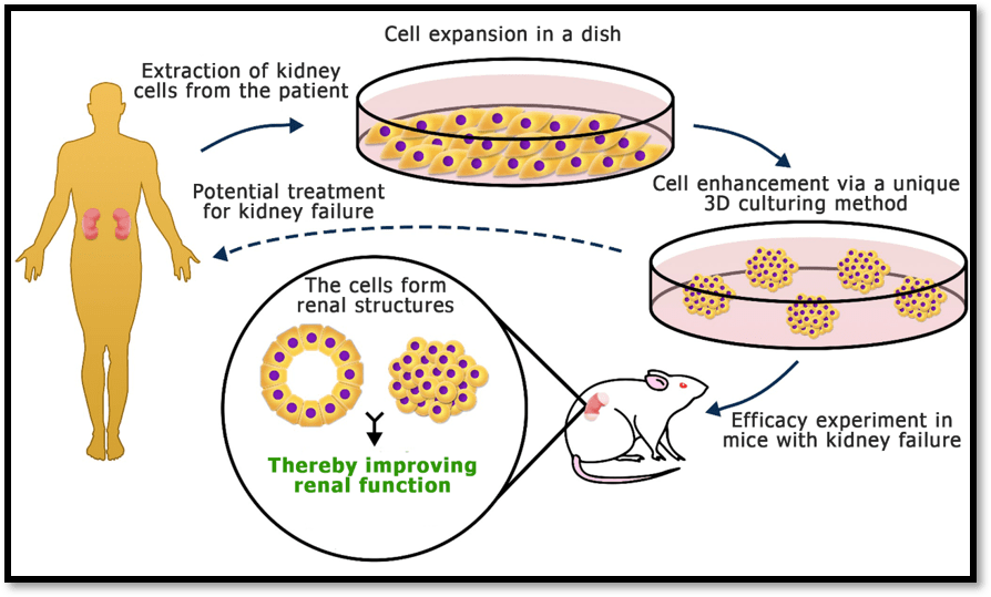 By generation of three-dimensional cultures called “kidney spheres,” the cells show improved function to generate new kidney tissue and replace lost cells. The new cells are then reintroduced into the kidney where they rebuild it, positively influencing neighboring cells and improving its function (see diagram).